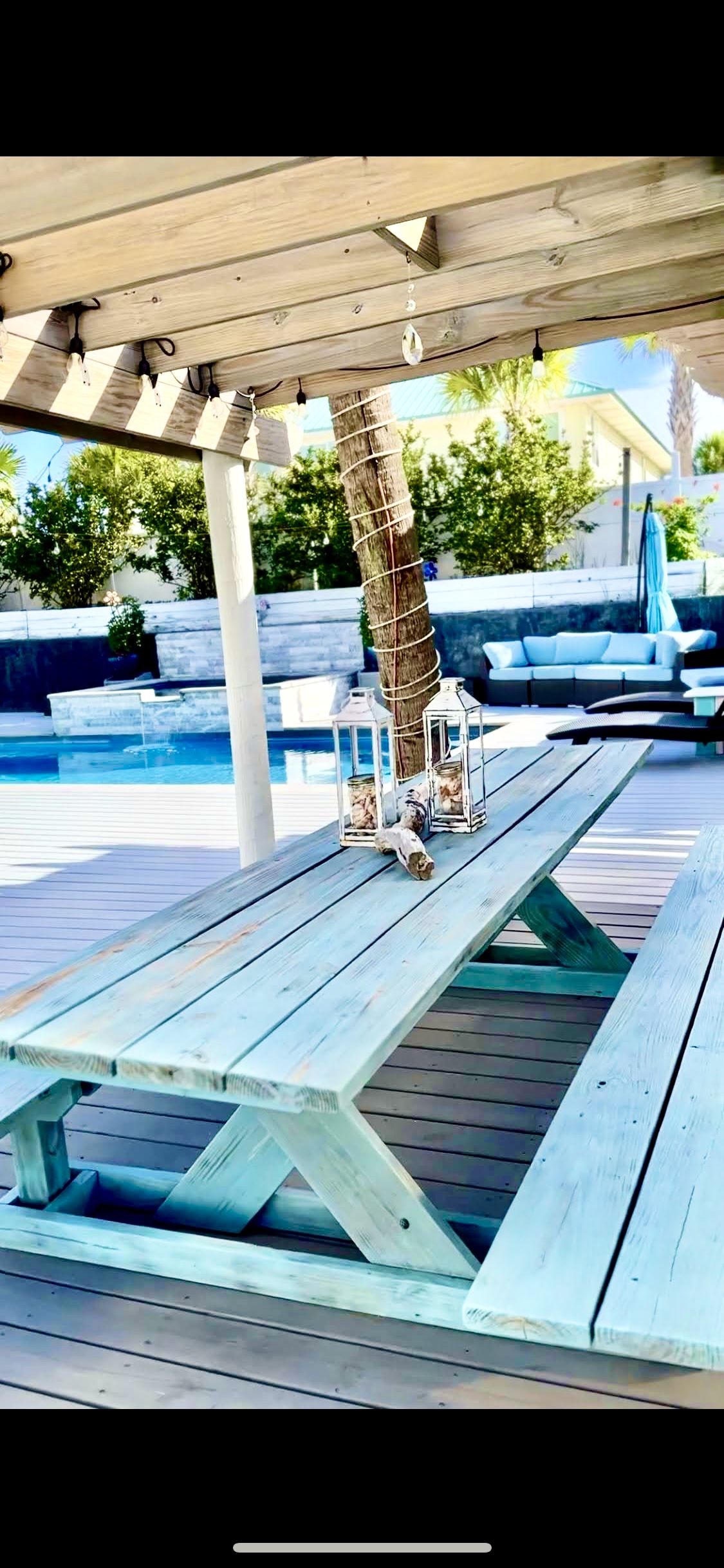 d outdoor living room while grilling. Play your music around the pool through the built-in Bluetooth stereo and enjoy sitting next to a private beach campfire setting while watching the kids self-entertain in the pool~ All without the interruptions of other vacationers in your space. Inside the house, you have a fully stocked kitchen with every dish and utensil to prepare and cook a simple or gourmet meal or snack. The main dining room table can seat 6 and the sofa table folds out to a full-size dining room table that can seat 6. There are plenty of games and puzzles for all ages and a large smart TV in the Living Room with 2 full-size sofas, one of them as a sleeper sofa. There is a laundry room with a full-size washer and dryer with a sink on the main floor along with 2 bedrooms- Kids room(2 bunk beds(4 XL Twin mattresses) and a bedroom(Queen-size bed) that overlooks the pool, and 1 full bathroom(tub/shower/toilet/single sink vanity) The upstairs(top floor level) has 1 full bathroom(soaker jacuzzi tub/standing shower/double sink vanity/toilet) 2 bedrooms- a master bedroom(King-Size bed) that has Sound Side water views and a bedroom(Queen-Size bed) with a balcony that overlooks the views of the Gulf and the Sound Side water views. If you like a heated pool contact us to have it heated upon arrival for an additional fee per day. (Pool heating is available from October to March-weather permitting) Every amenity we can think of you will have. EVERYTHING Listed is provided~ All Bed Linens, Pillows, Bath towels, Swimming Pool towels, Washcloths, and Hand towels. A starter set of Dishwasher Tablets, Dishsoap, Laundry Detergent, Toilet Paper, Paper Towels, and Kitchen Trash Bags are provided to get you through your first couple of days and then you will need to bring/purchase extra if needed. 4- Beach Cruisers Bicycles are available in the garage (2 Adults and 2 Young Adults) No helmets provided use at your own risk. 6- Beach chairs, 2 umbrellas, a cooler with wheels, and a beach cart are available. There are plenty of beach toys provided and donated by previous guests. Beach Directions-The closest walk to the beach is only a few minutes away as you need to walk around the houses to get there, just go down White Sands Blvd (west) to the stop sign and turn left (South Carolina) and you will see the beach 1/2 block in front of you. Other public beach accesses are within a short driving distance. All Beaches on the island are public and free parking. There are public beaches along the National Seashore(West towards Pensacola Beach) and a National Park-Opal Beach(3 mile drive from the house) with the option to purchase a daily pass or annual pass. This park has bathrooms and outdoor showers along with gazebos for use if not already rented out for events- Beautiful park -we highly recommend. Rules and Policies- No parties or events allowed Up to 2 dogs with preapproval at 200.00 per dog No smoking in or on property Cancelation Policy-You can cancel at anytime and receive a full refund 60 days befor your check-in, a 50% refund at 30 days before your check-in, there will be a 10% cancelation fee regardless. Example: your trip is 5,000.00, your cancelation fee will be 500.00.